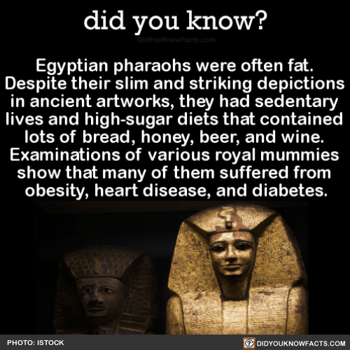 Egyptian pharaohs were often fat. Despite their slim and striking depictions in ancient artworks, they had sedentary lives and high-sugar diets that contained lots of bread, honey, beer, and wine. Examinations of various royal mummies show that many of them suffered from obesity, heart disease, and diabetes. Source Source 2 Source 3