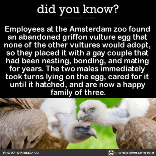 Employees at the Amsterdam zoo found an abandoned griffon vulture egg that none of the other vultures would adopt, so they placed it with a gay couple that had been nesting, bonding, and mating for years. The two males immediately took turns lying on the egg, cared for it until it hatched, and are now a happy family of three. Source Source 2