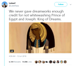 The Prince of Egypt: *consults with countless scholars from all three Abrahamic religions to make sure they were telling the story correctly, hires notable black and Jewish talent for the voice cast, taps the guy who played Coalhouse Motherfluffing Walker in “Ragtime” (a show all about racial tensions in America) on Broadway to sing one of the film’s most beautiful songs, taps the same Israeli singer to reprise her role as Yochaved in almost every foreign dub of the film, and is generally much more respectful to its source than any live-action Biblical epic released in the past fifty years*