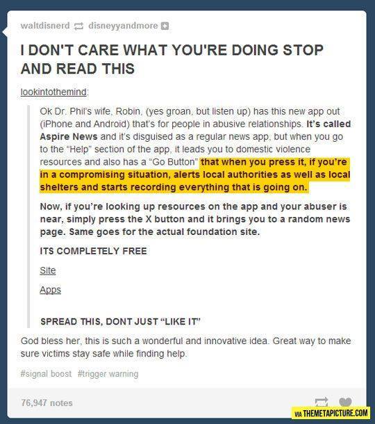 a few years ago we had to go to a domestic violence shelter and this is the app my mom used. she was able to contact them while my dad was still in the house and he didn’t know until the next morning after we left. seriously, if you see this, reblog it. you never know who needs it.