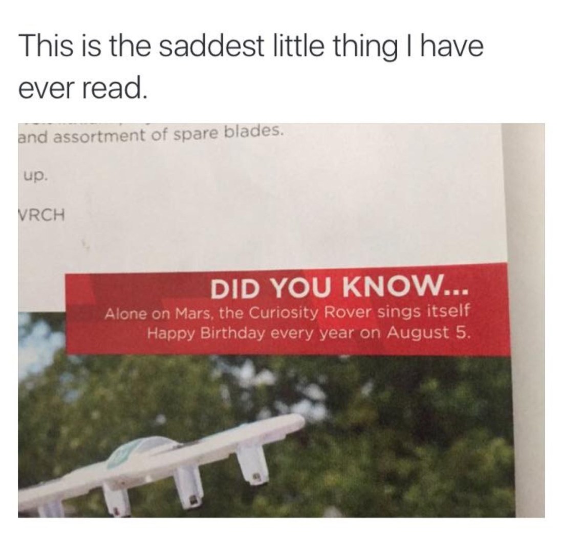 This isn’t a sad story, this a happy story about the ridiculousness of humans and the way we love things. We built a little robot and called it Curiosity and flung it into the star to go and explore places we can’t get to because it’s name is in our nature and then just because we could, we taught it how to sing.